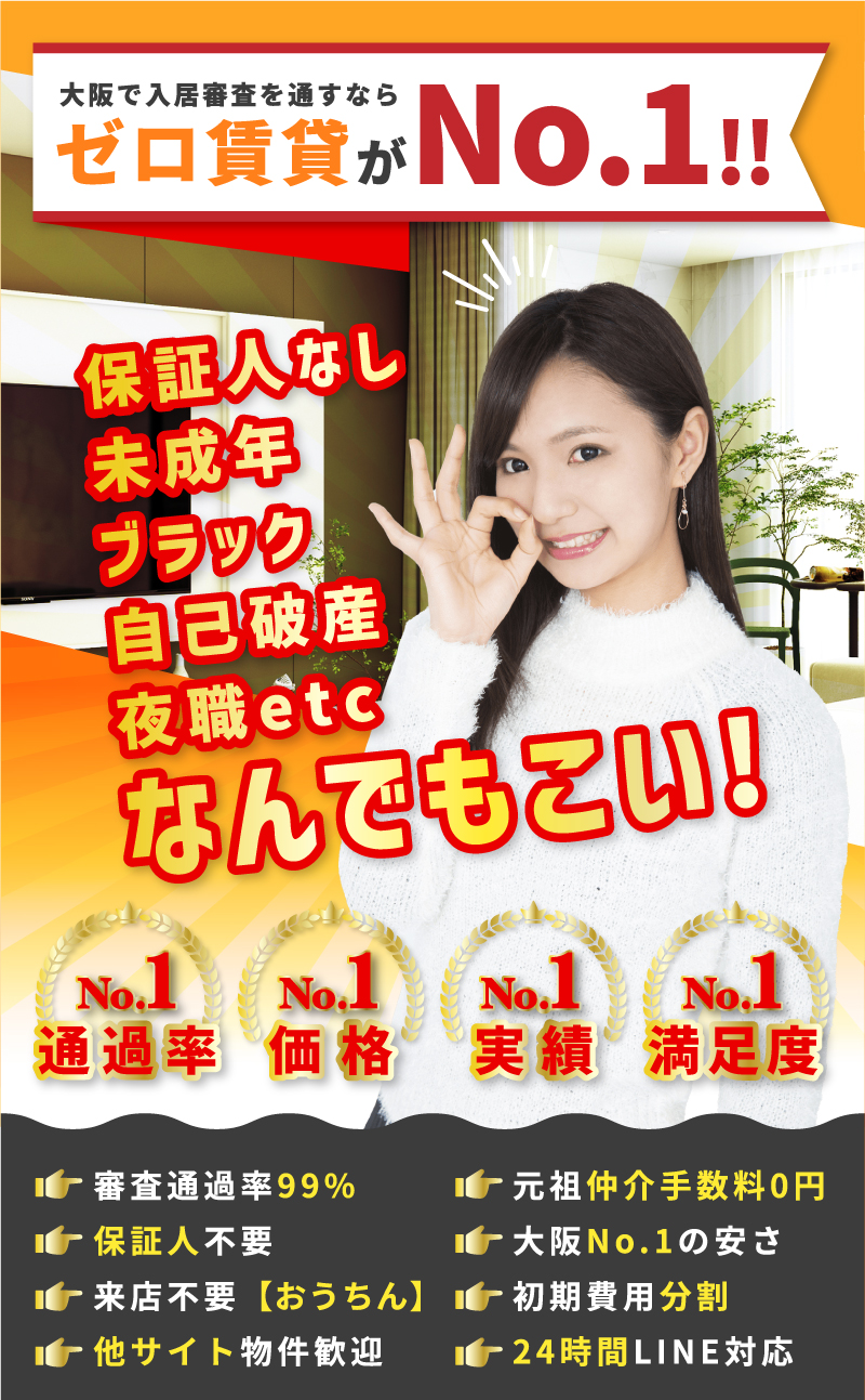 - 当サイトは、元祖仲介手数料無料のゼロ賃貸が お届けする、入居審査が通らない方・保証人不要の物件を探している方専門の賃貸物件 お部屋探しサイトです。 大阪で14年以上仲介手数料無料で物件のご紹介 をしてきた実績がございます。安心して、お得 にとにかく安く!お部屋を探しましょう!